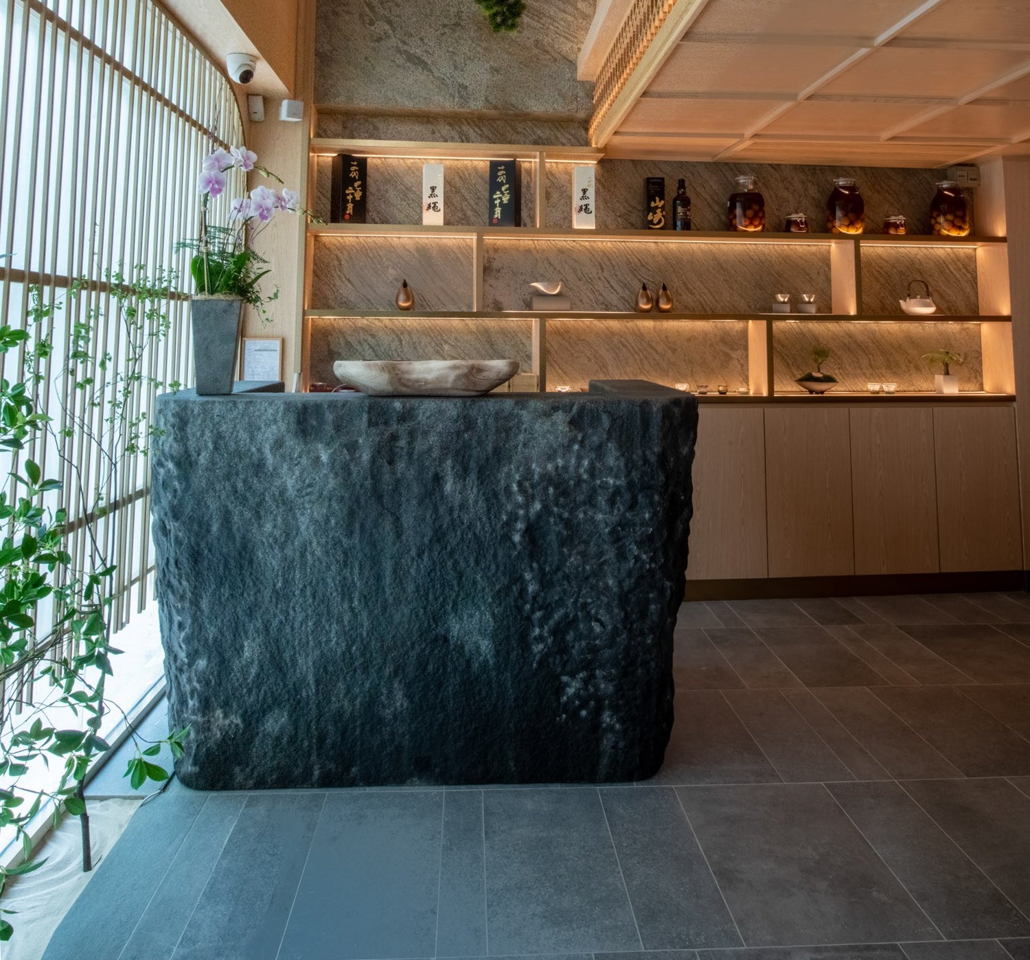 Stepped in the tradition, yet anything but conventional, the concept from the “Kyōto” zen garden base. The reinterpretation of traditional Japanese architectural elements features colour and ornaments symbolic to Kyoto, such as piles up with lacquer, wood grains, stones, pruned trees, etc., lend a unique appeal to the restaurant.