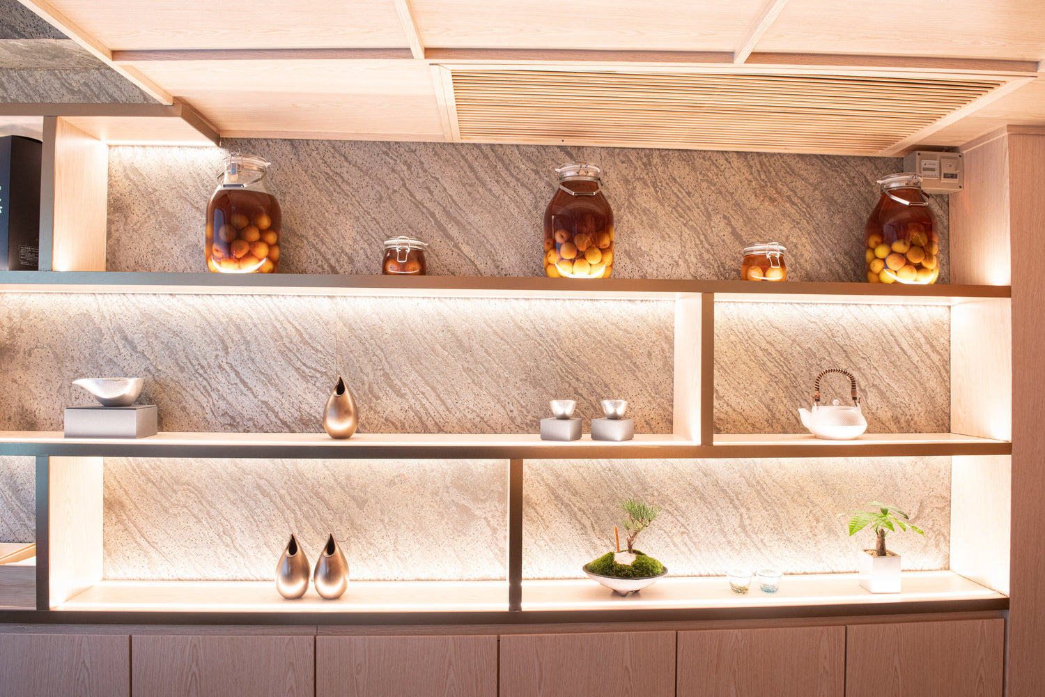 A smooth omakase wide counter presented elegantly and discreetly forms a stunning wooden material palette. It’s made flat and low, so the chefs interact easily with the guest. Wrapped in a warm ambience, you enjoy artistically designed cuisines while seated comfortably on the retro dining chair.